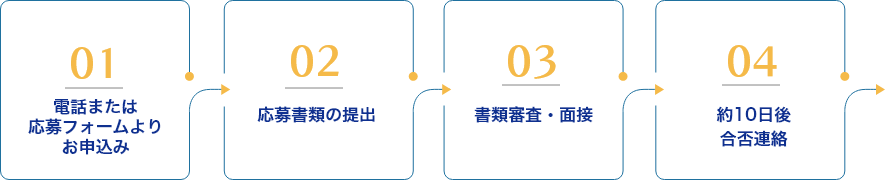 | 応募書類 | 履歴書(市販のもので可)(写真貼付)、資格証明書、大卒の場合は卒業証明書 |